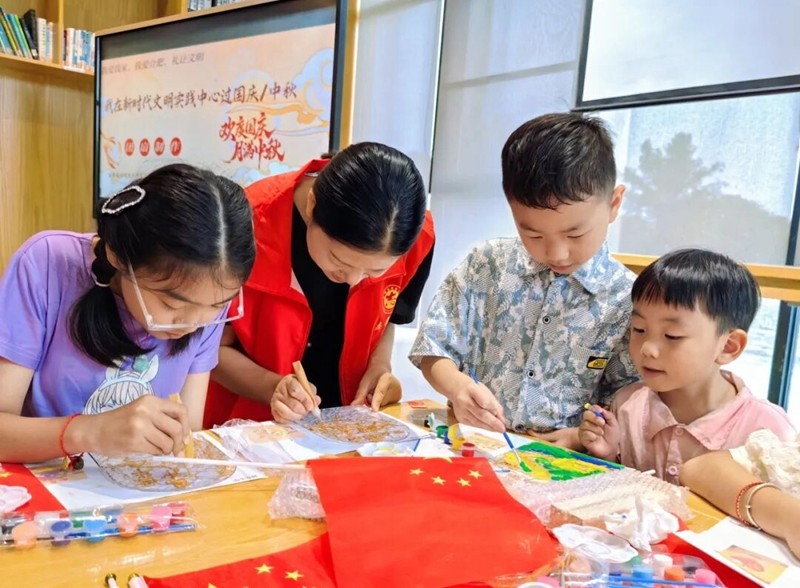 9月27日,文翁书院变身“童趣工坊”,30名小朋友齐聚一堂,参与庆国庆迎中秋珐琅玻璃画制作活动。活动中,孩子们在志愿者的指导下,认真学习掐丝、制作沙料、填画等步骤,用稚嫩的小手勾勒线条、填充色彩,将对祖国的祝福融入一幅幅作品中。斑斓的珐琅玻璃画不仅展现出祖国的繁荣昌盛,更在孩子们心中悄悄种下了爱国情怀的种子。