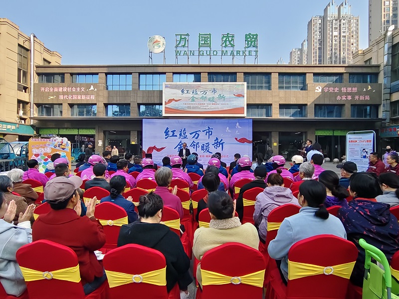 2025年11月14日上午,合肥市包河区滨湖世纪社区万国农贸街区南广场气氛庄重而热烈,“红蕴万市·金邻暖新——万国农贸街区党支部揭牌暨‘金邻暖新驿站’启用仪式”在此成功举行。包河区委组织部、区委社会工作部、滨湖世纪社区党委相关负责同志,万国农贸街区党支部全体党员、党员经营户、市场管理方、新就业群体代表、“金邻帮帮团”成员单位、商户联盟代表等约60人参加了活动。此次活动标志着万国农贸街区党建引领城市精细化管理迈入新阶段。