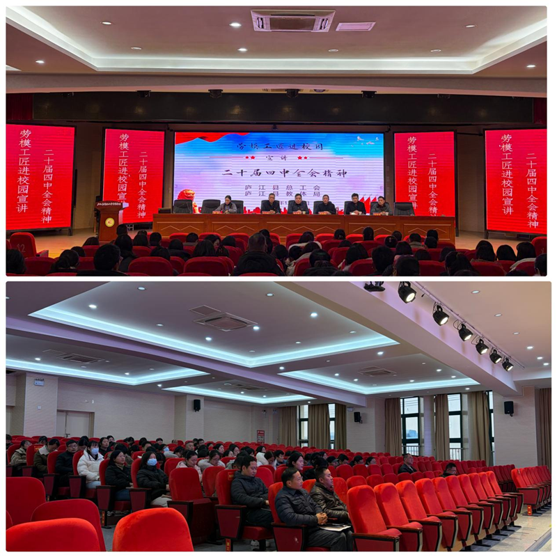 为深入学习贯彻党的二十届四中全会精神,将全会精神转化为推动教育高质量发展的强大动力。12月22日,由庐江县总工会、庐江县教体局主办的劳模工匠进校园宣讲二十届四中全会精神宣讲活动在城北小学幸福校区举行,庐江县劳模工匠创新人才工作室领衔人、城关小学副书记卢东红担任宣讲人,城北小学幸福校区执行校长宋丽主持了宣讲活动。庐江县教体局副局长周文武、庐江县总工会党组成员马树山等出席了本次活动。